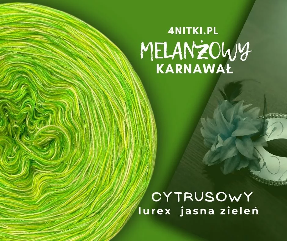 UWAGA! Na zdjęciu głównym wersja z dodatkiem LUREX-u JASNO ZIELONEGO, które NIE są uwzględnione w cenie standardowej produktu. Dodaj lurex poniżej ustawiając wariant produktu. Wówczas lurex będzie nawinięte na motek jako dodatkowa nić.