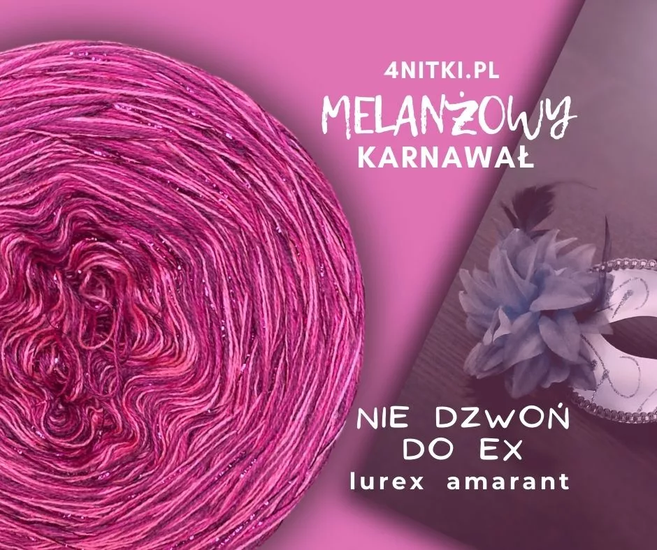 UWAGA! Na zdjęciu głównym wersja z dodatkiem LUREX-u AMARANTOWEGO, które NIE są uwzględnione w cenie standardowej produktu. Dodaj lurex poniżej ustawiając wariant produktu. Wówczas lurex będzie nawinięte na motek jako dodatkowa nić.