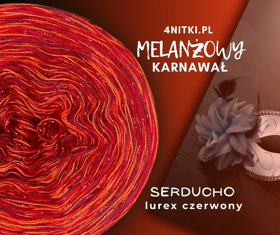 UWAGA! Na zdjęciu głównym wersja z dodatkiem LUREX-u CZERWONEGO, które NIE są uwzględnione w cenie standardowej produktu. Dodaj lurex poniżej ustawiając wariant produktu. Wówczas lurex będzie nawinięte na motek jako dodatkowa nić.